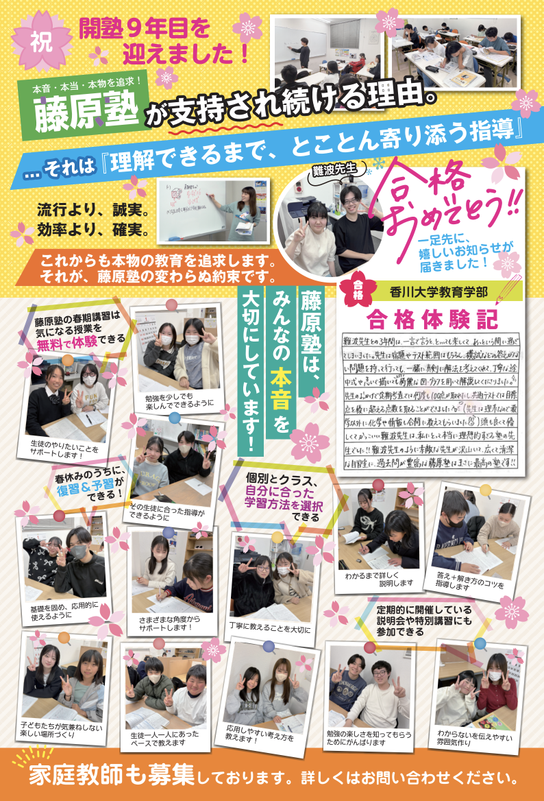 藤原塾の中学生のクラス授業は、東かがわ市・さぬき市のカリキュラムに、高校生のクラス授業は、三本松高校のカリキュラムに完全対応!